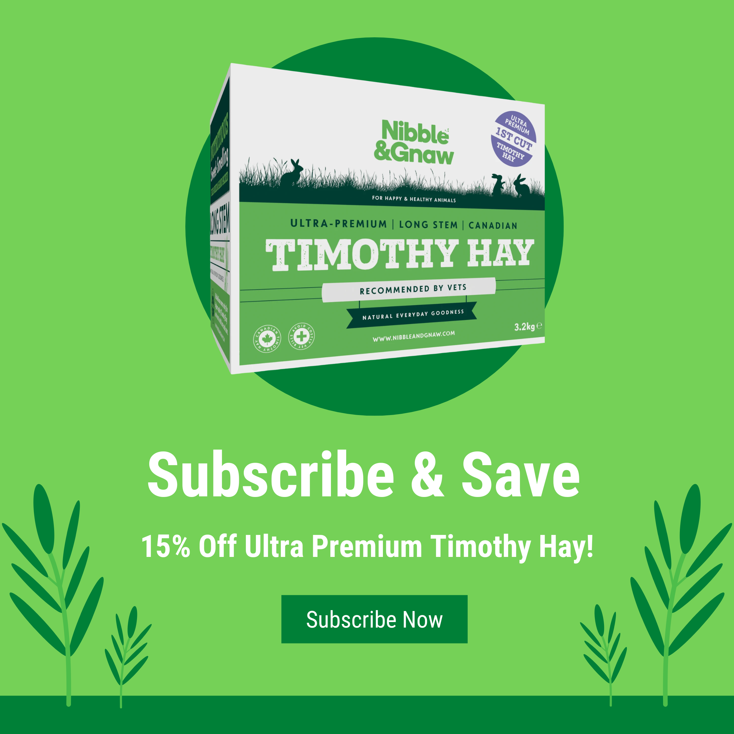 Fresh, dust-free Timothy hay will be delivered straight to your door as often as you like, ensuring your pets always have the high-quality nutrition they need. Plus, you’ll enjoy 15% off every subscription order—a little extra savings for you and your nibbler!